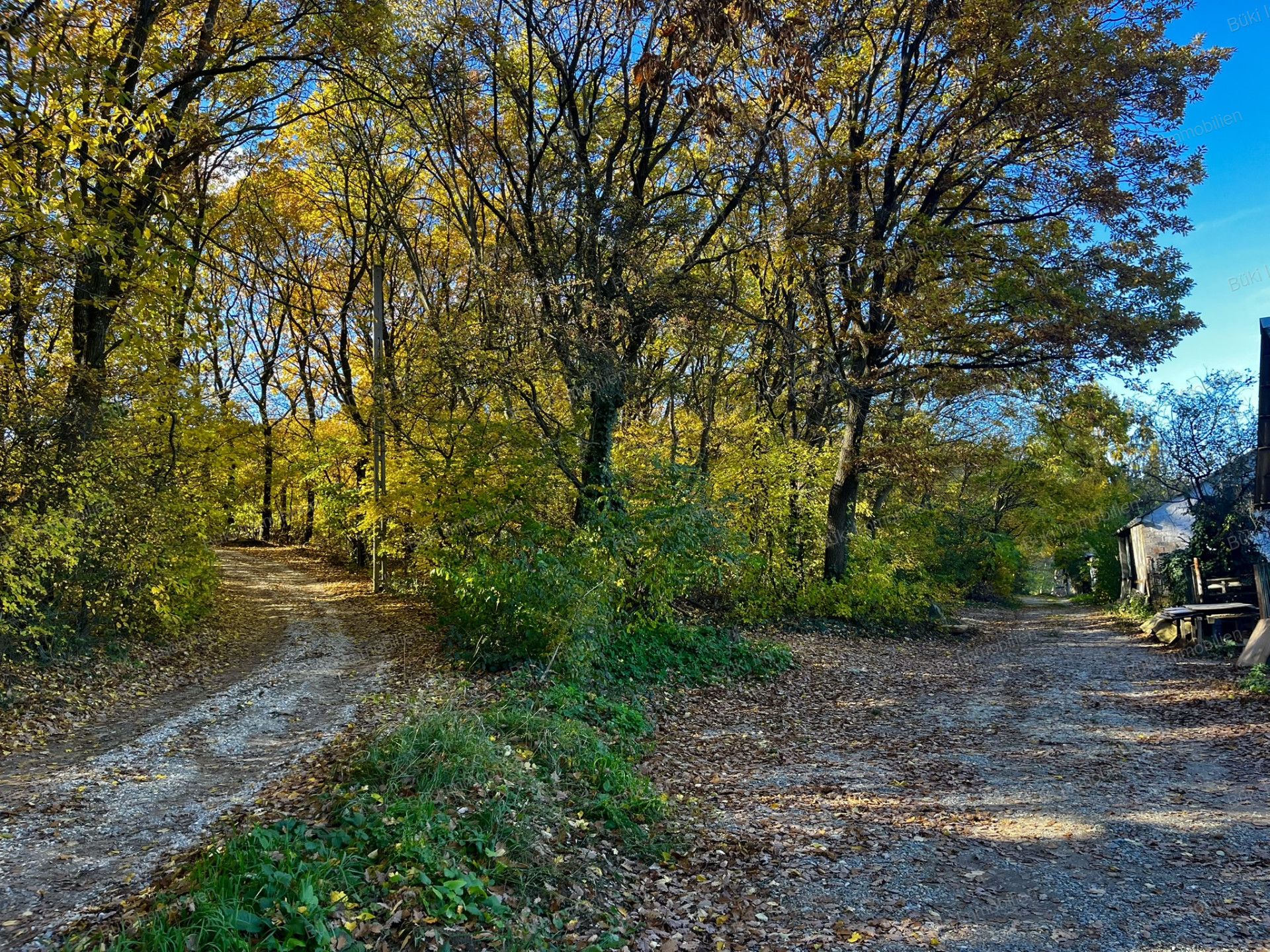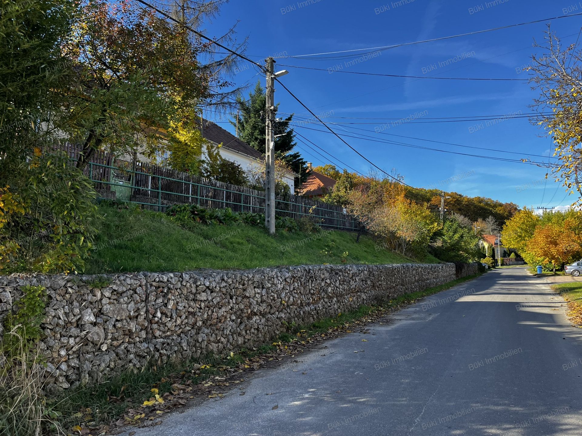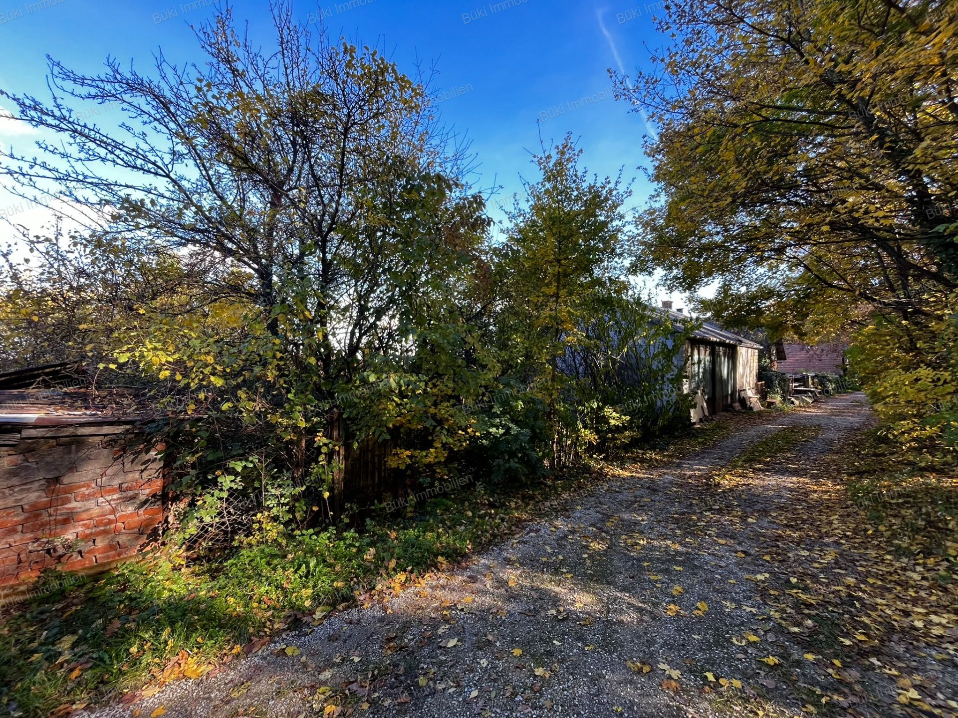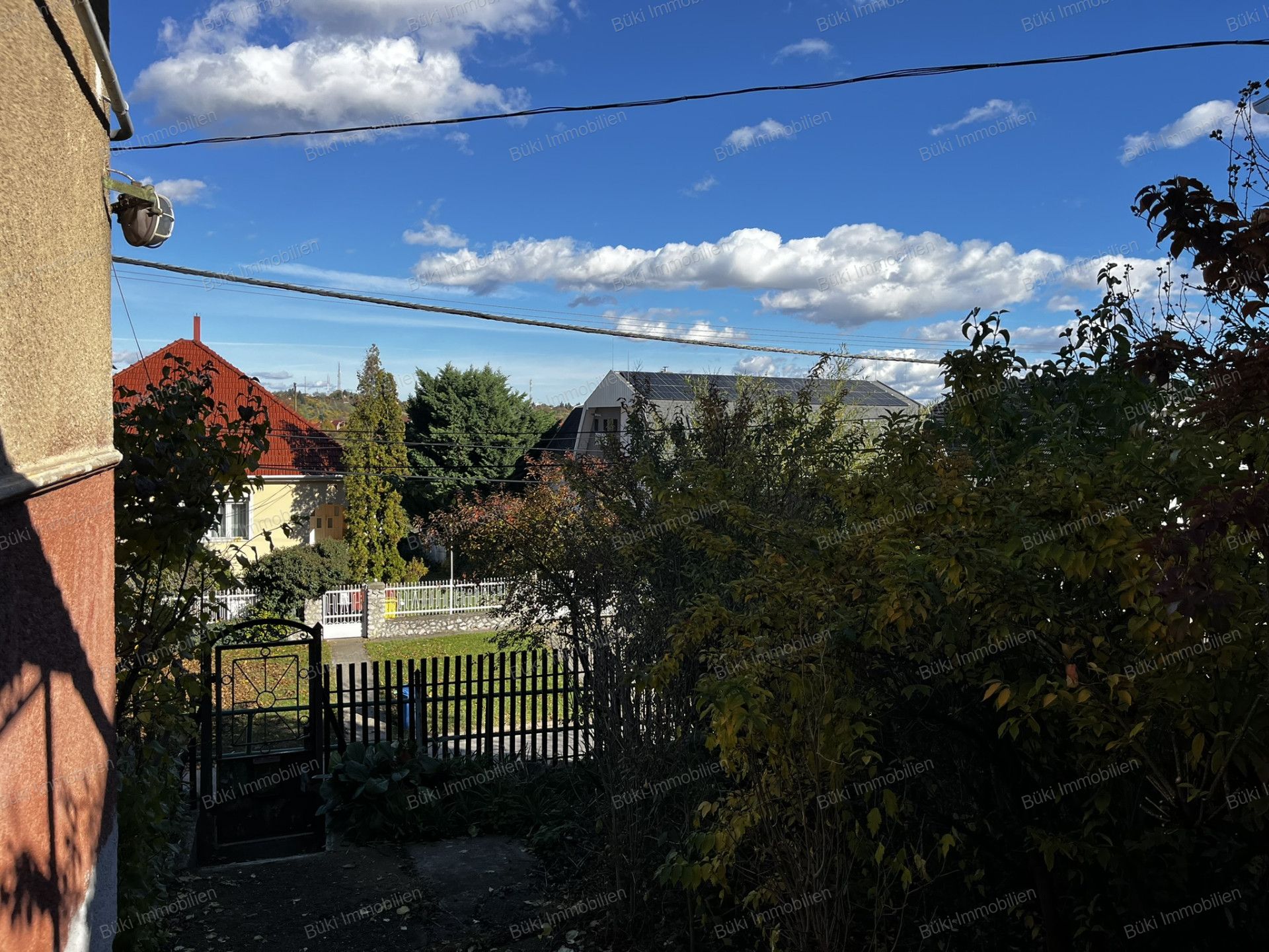A ház két irányból is megközelíthető : az utcafront felől és a kert hátsó részéből, ahol akár garázs is kialakítható. Az udvaron fedett terasz, szőlőlugas és két árnyékot adó fenyőfa teszi kellemesebbé a nyári napokat. A kert igazi kincseskert: alma-, körte-, szilva-, dió- és birsalmafák, valamint málnás és szedres rész várja új gazdáját. A telek végében már az erdő kezdődik, túraútvonalakkal hátsó szomszéd nélkül.